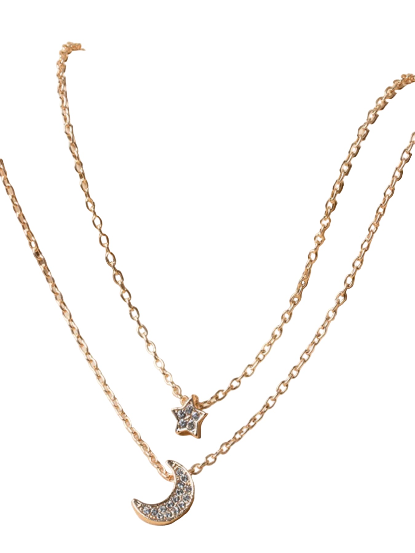 This stunning double layered necklace features delicate celestial-inspired pendants including a charming star and crescent moon design. Crafted with high-quality gold-toned metal chain, this necklace offers both elegance and versatility. The dual-layer design creates depth and visual interest, making it perfect for modern women who appreciate minimalist yet meaningful jewelry. The celestial motifs represent dreams, guidance, and feminine energy, while the adjustable chain length ensures comfortable wear for various necklines. Ideal for gifting or personal collection, this necklace combines contemporary fashion with timeless celestial symbolism.